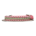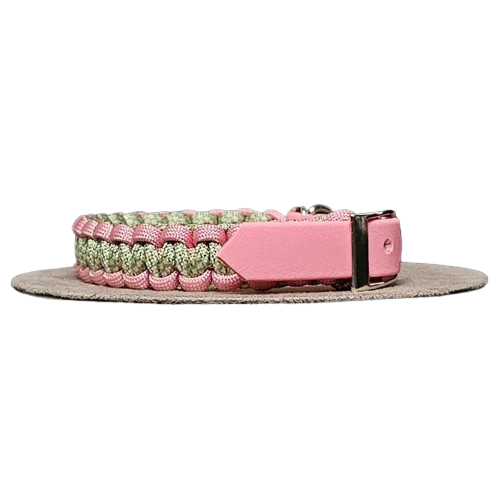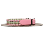 Collare in Paracord 550 nei colori Rosa pastello – Diamante Guacamole e crema, regolabile attraverso una cintura di Biothane colore rosa.
